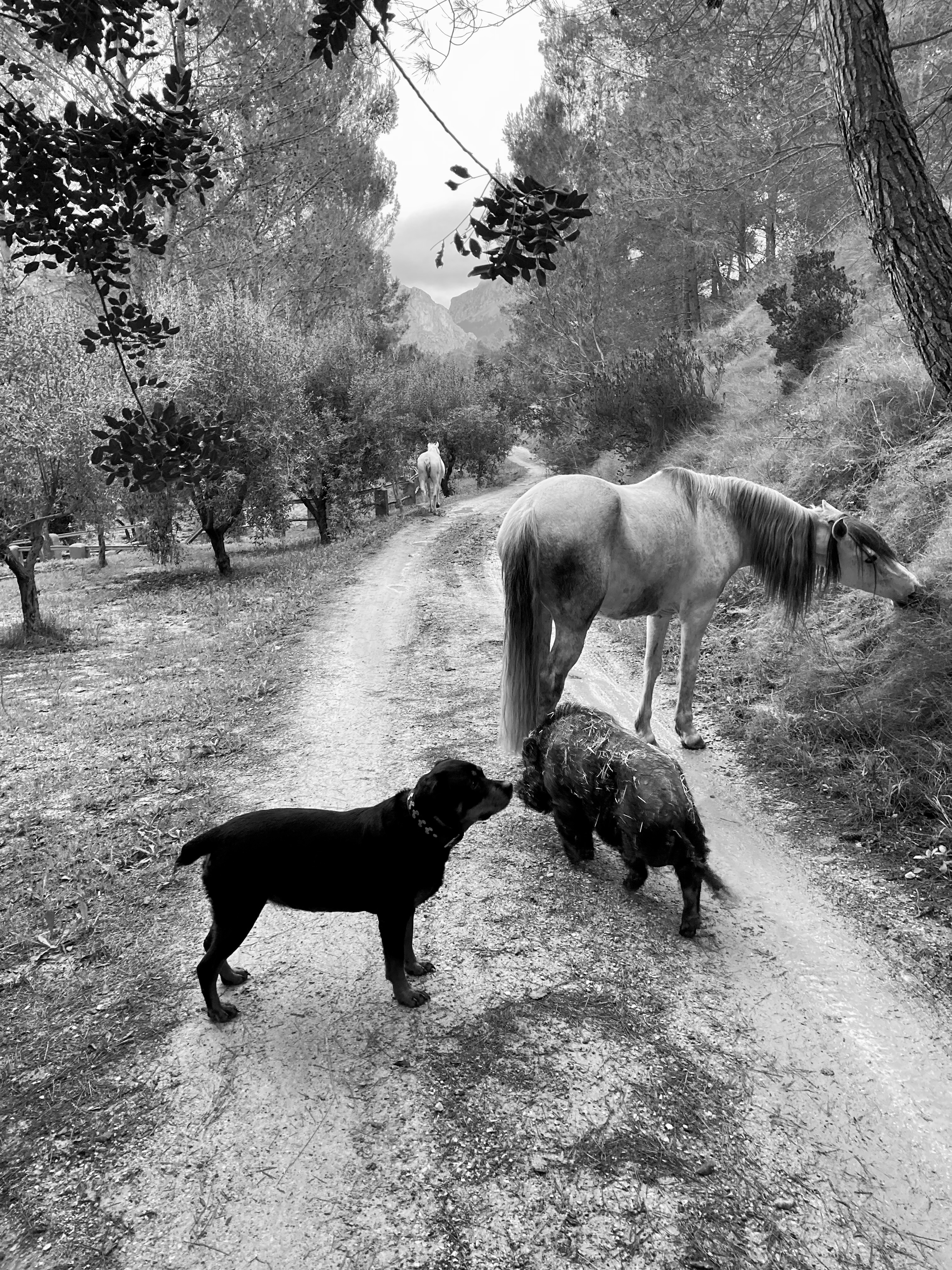 Časť z nášho farmového osadenstva: pes Canela, skrotený divočák Cerdito a andalúzsky kôň Star